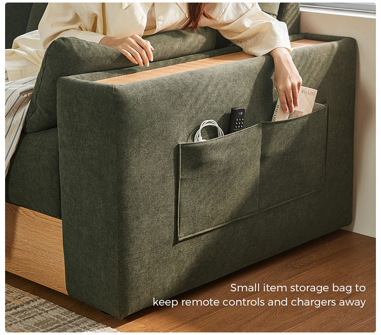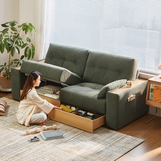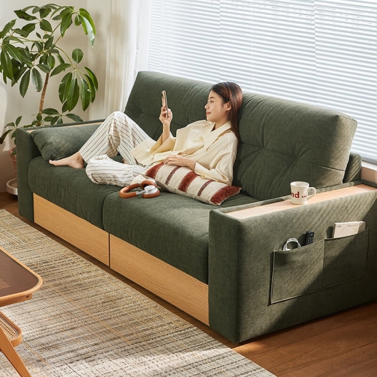 Nosso sofá-cama de tecido foi projetado para oferecer o melhor dos dois mundos. Durante o dia, funciona como um sofá confortável e elegante onde você pode relaxar, receber convidados ou desfrutar de bons momentos com sua família. Ao cair da noite, transforma-se facilmente numa cama acolhedora e espaçosa, proporcionando um espaço confortável para dormir para os hóspedes durante a noite ou criando um local confortável para si.