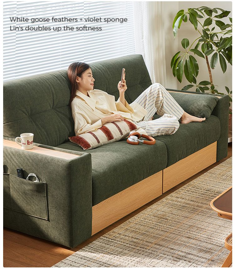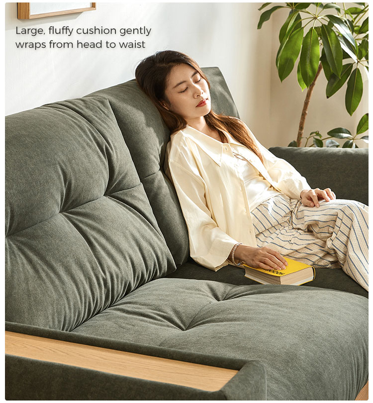 A superfície do sofá apresenta rugas naturais, como ondas de luz e sombras, com um bom equilíbrio entre claro e escuro. O preenchimento completo de penas cinzentas de ganso e algodão de boneca faz com que todo o corpo afunde na suavidade, como se estivesse nas nuvens.