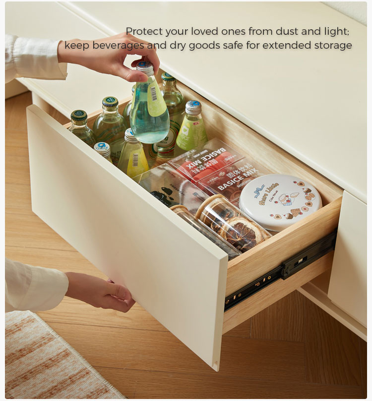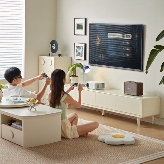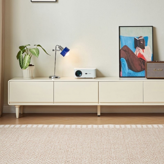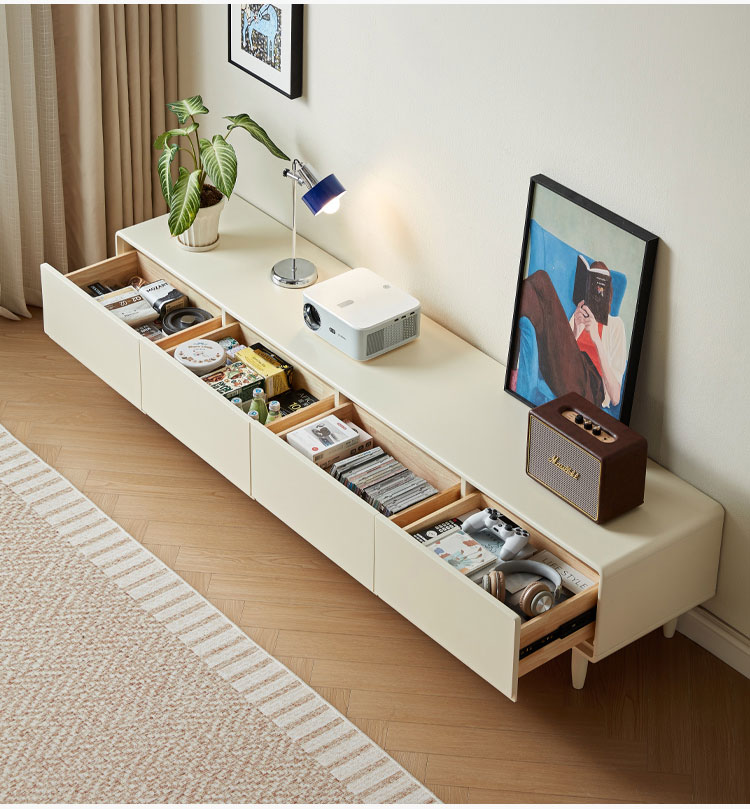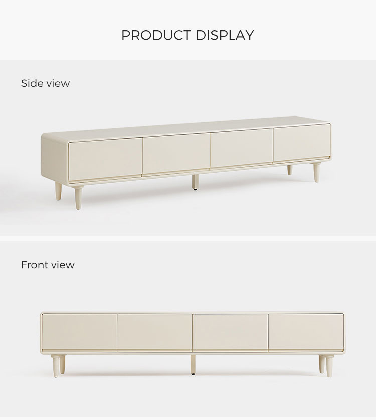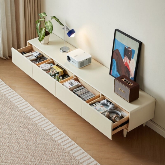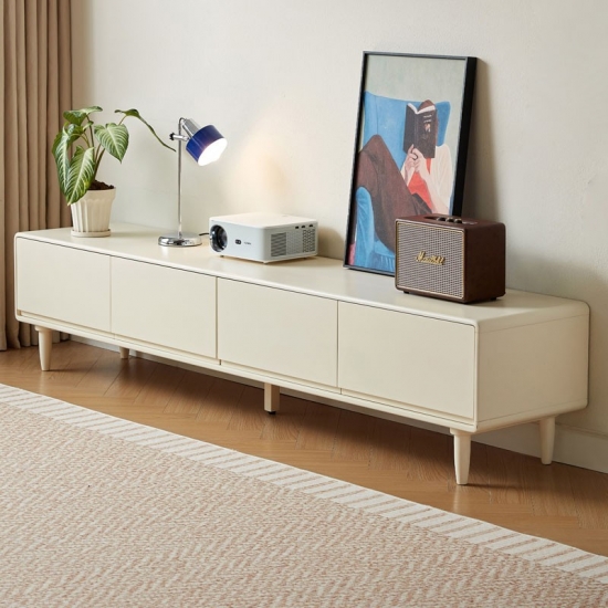 Este elegante móvel para TV de 1,8 metros de largura combina linhas simples com armazenamento prático. Com quatro gavetas de deslizamento suave e pés de madeira robustos, oferece uma sensação de leveza e amplitude, mantendo seus itens essenciais de mídia organizados e ao alcance das mãos. Seu acabamento branco impecável e silhueta minimalista criam um ponto focal luminoso e arejado para qualquer ambiente.