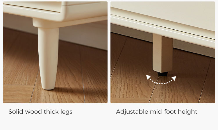 Elevação elegante: Fabricada em madeira maciça, a base elevada não só proporciona estabilidade duradoura, como também confere um visual leve e contemporâneo. O espaço livre facilita a limpeza e adiciona um toque de design refinado.