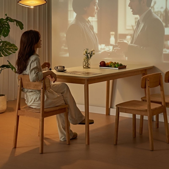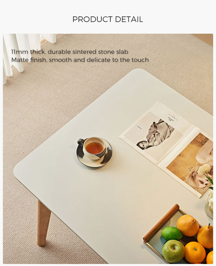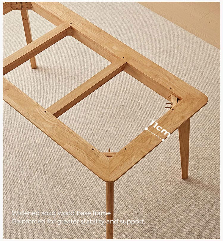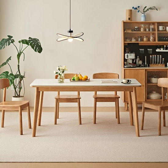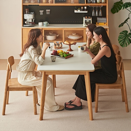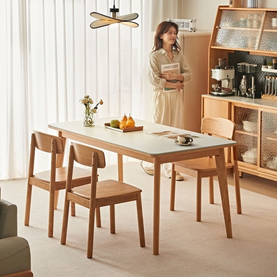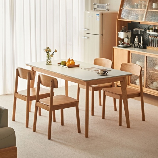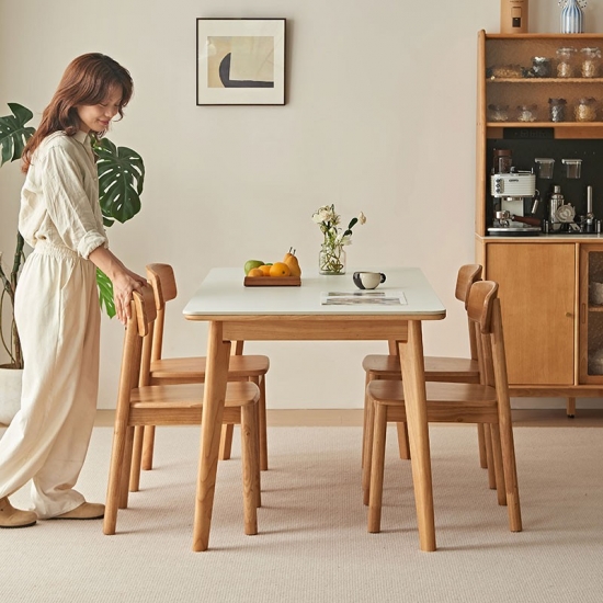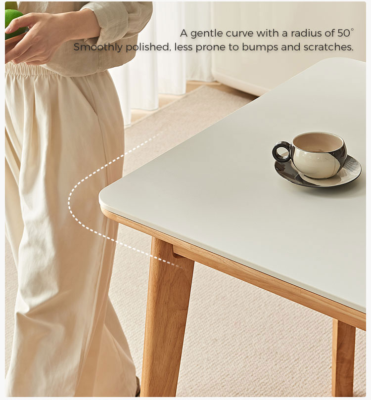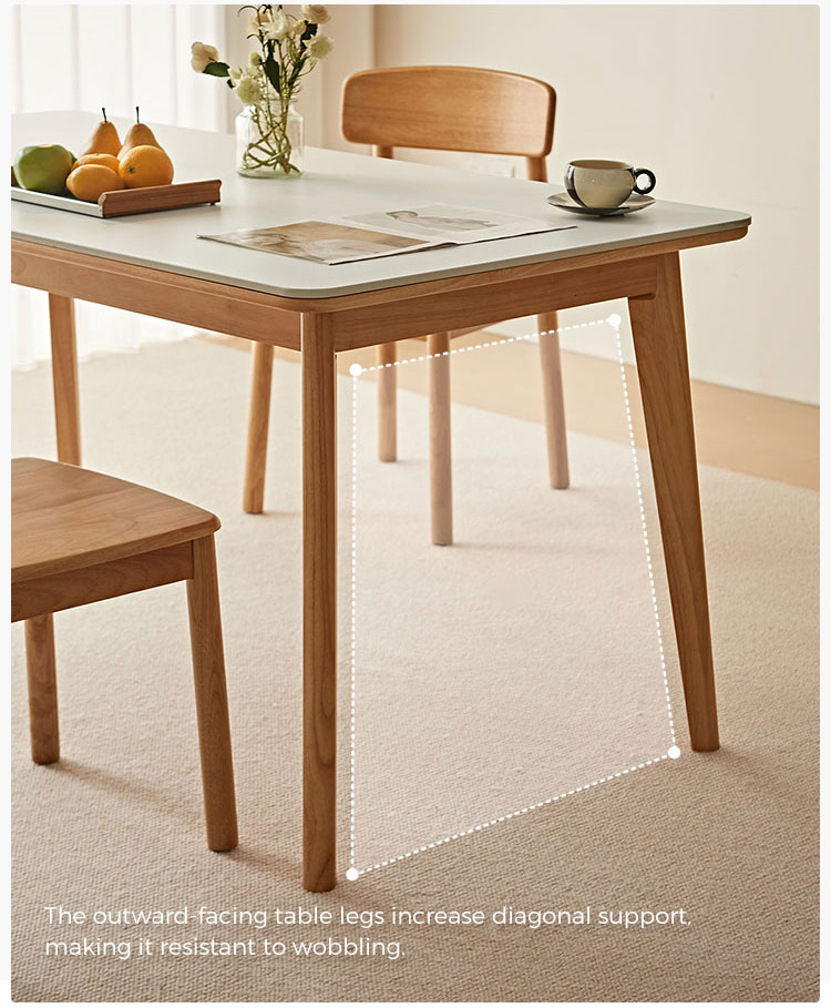 Base e pés: A mesa é sustentada por uma estrutura sólida e elegantemente simples, feita de pés de madeira maciça. Os pés geralmente têm um acabamento limpo e liso, frequentemente em um tom natural claro ou branco puro para combinar com o tampo da mesa.