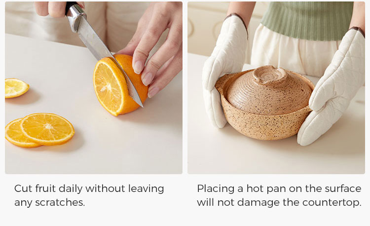 Tampo: A característica principal é a sua superfície de pedra brunida (pedra soprada a fogo). Este tampo é criado através de um tratamento especializado em alta temperatura que realça as variações naturais de cor da pedra e cria um acabamento texturizado único.