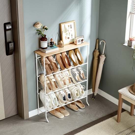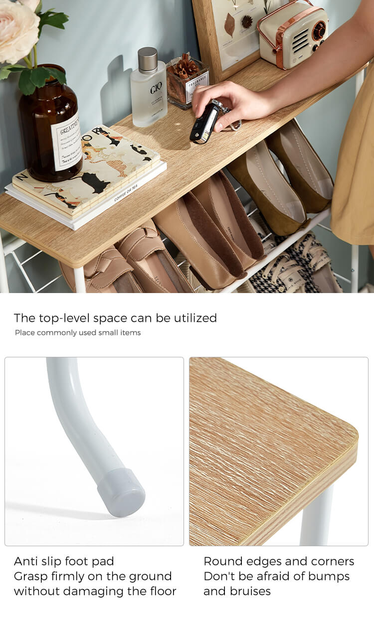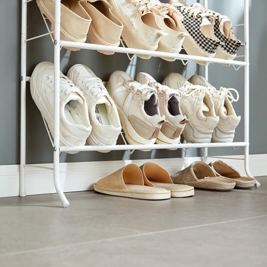 Este foi atualizado para uma sapateira de tubo de aço de duas fileiras, que oferece mais espaço para acomodar sapatos, botas, etc., mas também bolsas, guarda-chuvas e livros. Esta sapateira tem um design simples para se adequar a qualquer decoração de casa e trazer um toque moderno ao seu espaço.