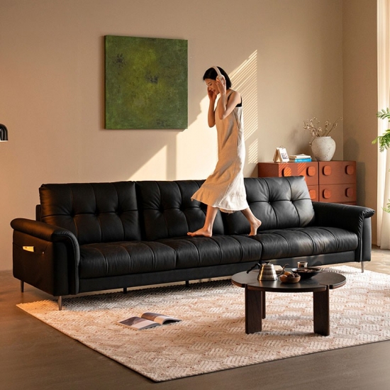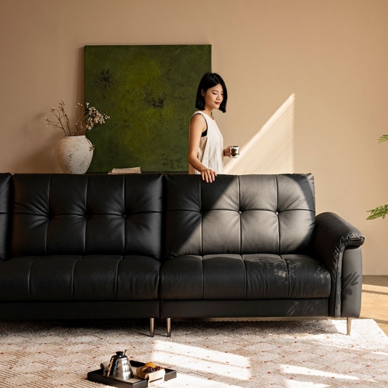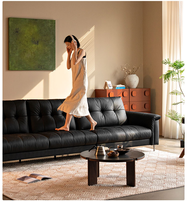 Ao contrário do couro preto fosco, nosso acabamento chesterfield preto disfarça arranhões com perfeição, adicionando profundidade dimensional ao seu espaço. O equilíbrio perfeito entre sofisticação e conforto. Confira o novo sofá macio preto, ideal para renovar sua sala de estar.