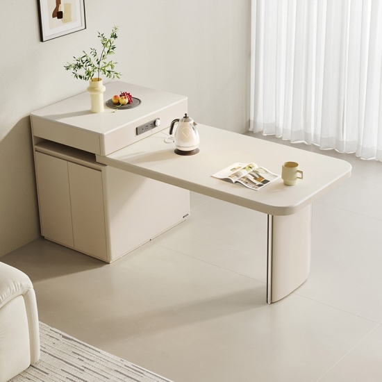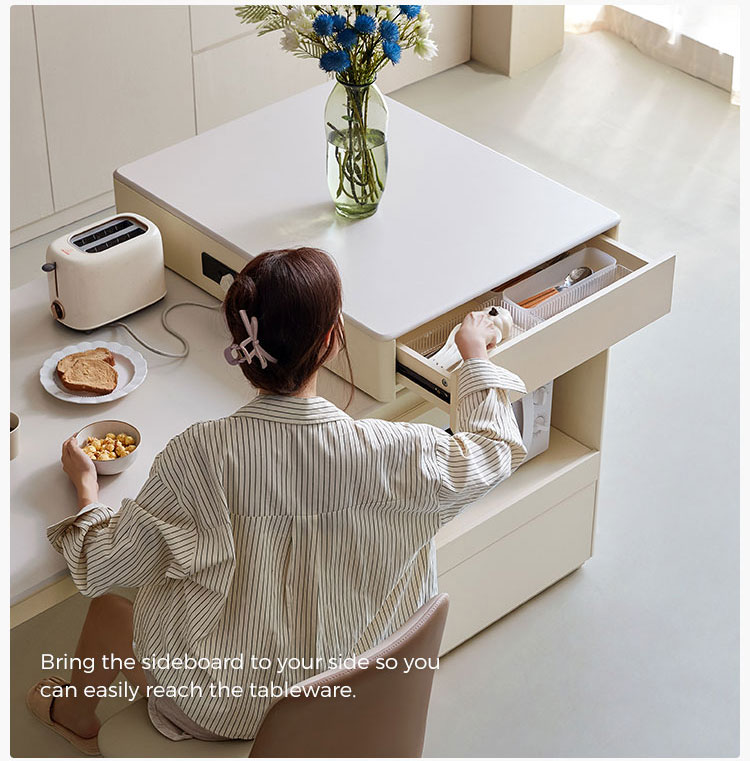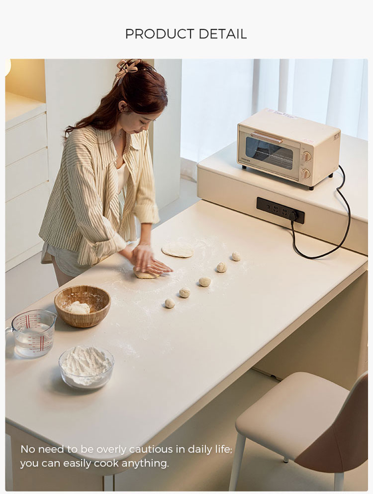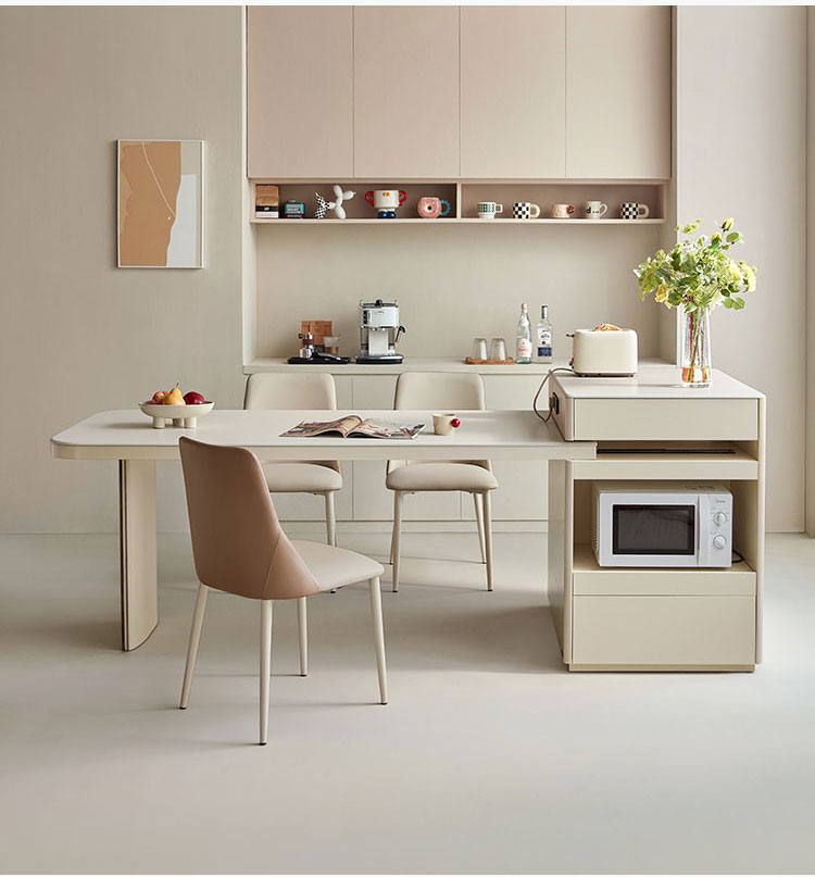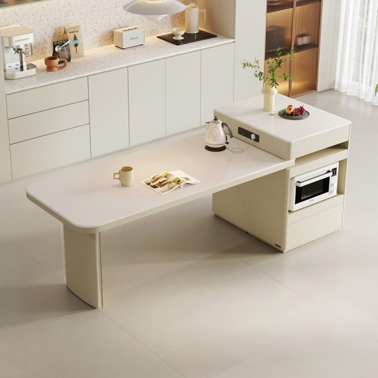 Esta sofisticada ilha de cozinha branca é a peça central da vida moderna. Fabricada com pedra sinterizada branca resistente, oferece um espaço de trabalho uniforme e higiênico que se integra perfeitamente à iluminação ambiente. A ilha apresenta uma base de madeira distinta. , acrescentando calor e textura orgânica para criar uma atmosfera acolhedora.