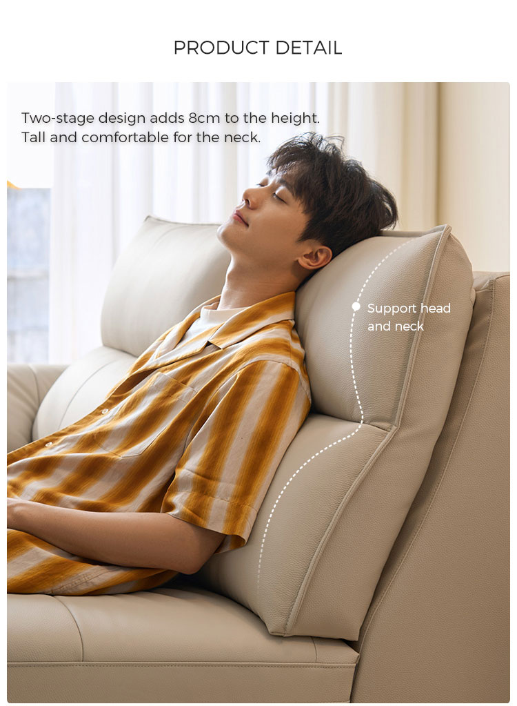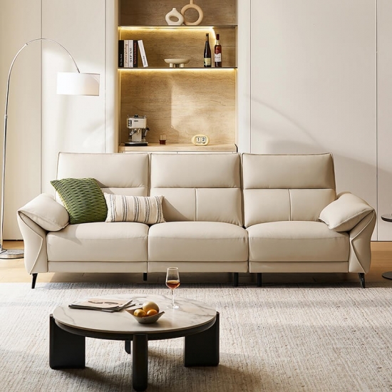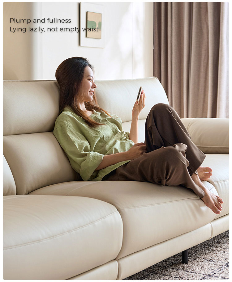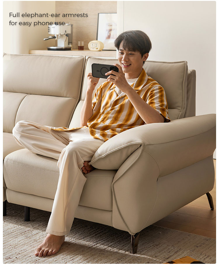 Estofamento em couro premium: Feito com couro de flor integral de alta qualidade, este sofá oferece um toque macio e flexível, além de ser construído para durar. A superfície natural resiste ao desgaste e desenvolve um caráter único com o uso, garantindo que fique ainda mais bonito com o tempo.