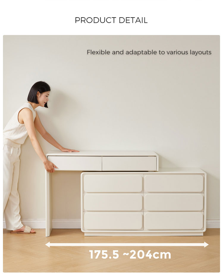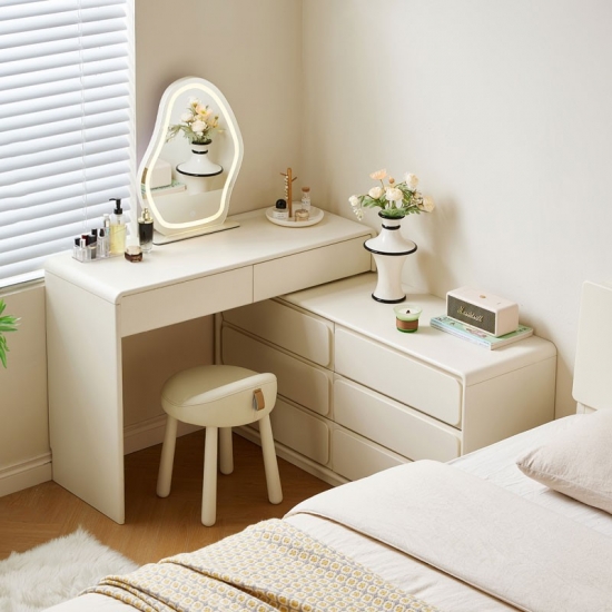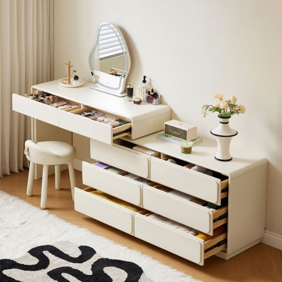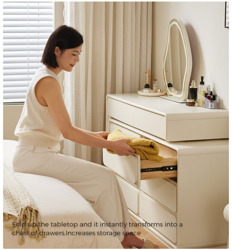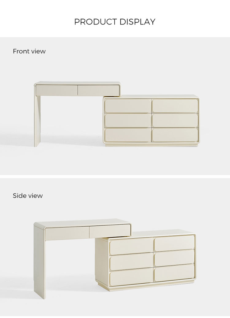 Eleve sua rotina diária com nossa requintada penteadeira branca, uma combinação perfeita de elegância atemporal e funcionalidade moderna. Este belo conjunto apresenta uma espaçosa penteadeira com seis gavetas para armazenamento organizado e é coroada com um espelho em formato de nuvem. Projetada para criar um ponto focal sereno e elegante em seu quarto ou camarim.