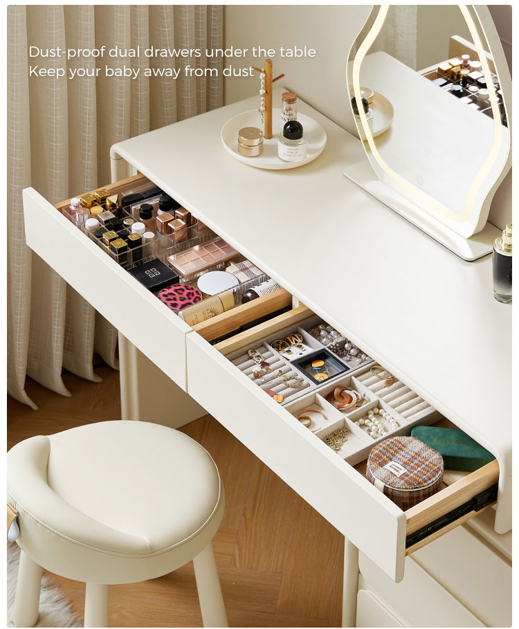 Design integrado: Conectando perfeitamente o espelho e a penteadeira, este conjunto oferece uma aparência coesa e elegante, eliminando a necessidade de procurar peças combinando.
