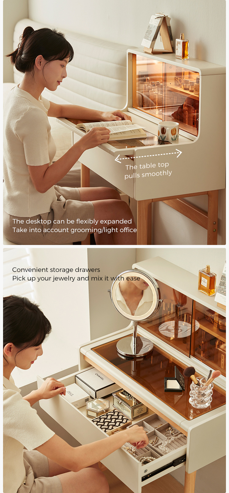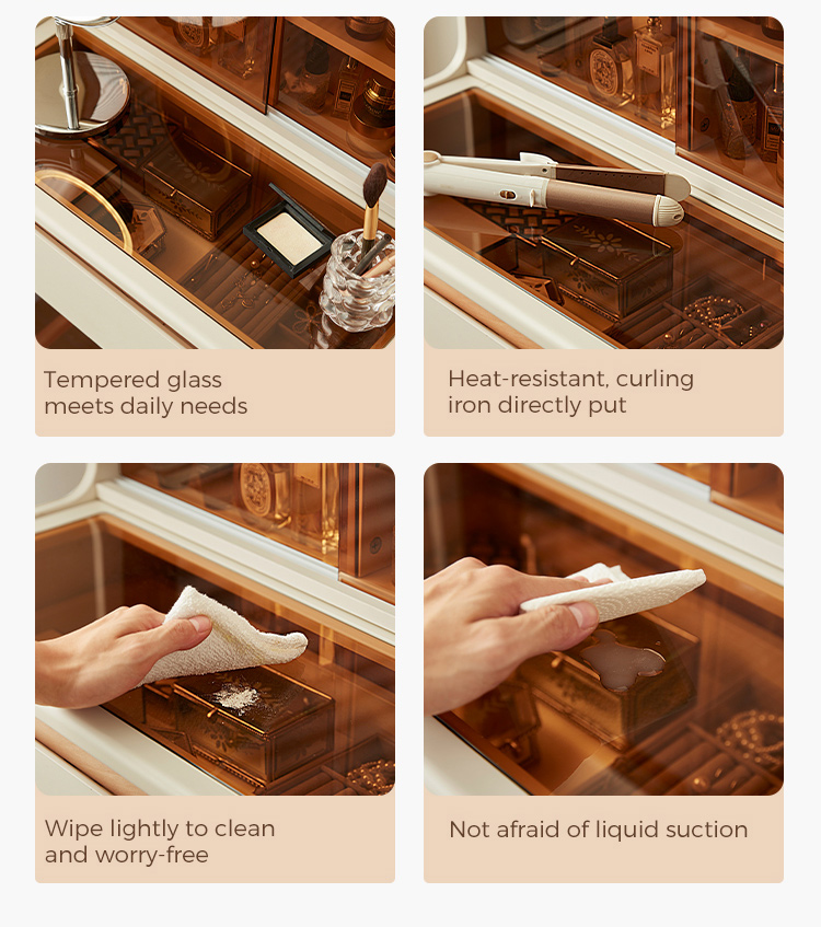 *Amplo armazenamento – Gavetas e compartimentos espaçosos mantêm cosméticos, joias e itens essenciais organizados.