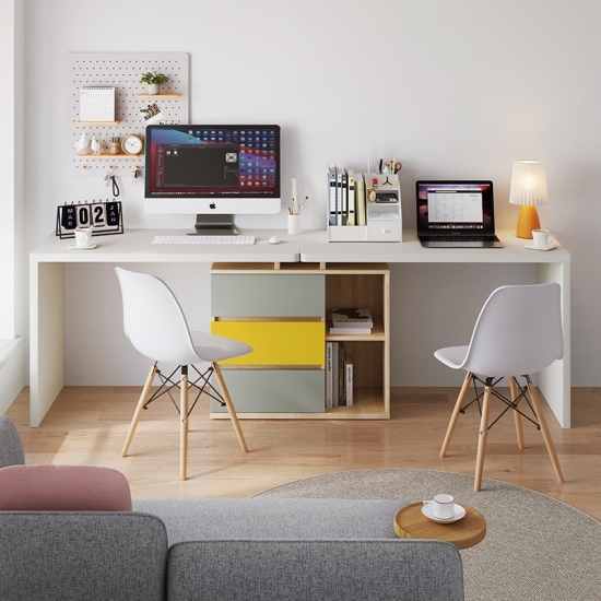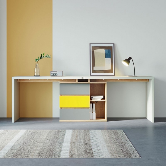 01. Design que economiza espaço: otimiza o layout do ambiente com uma solução combinada de mesa e armazenamento.