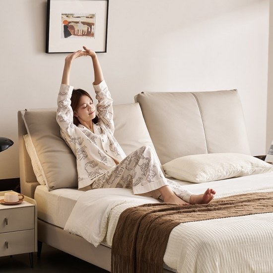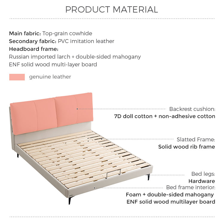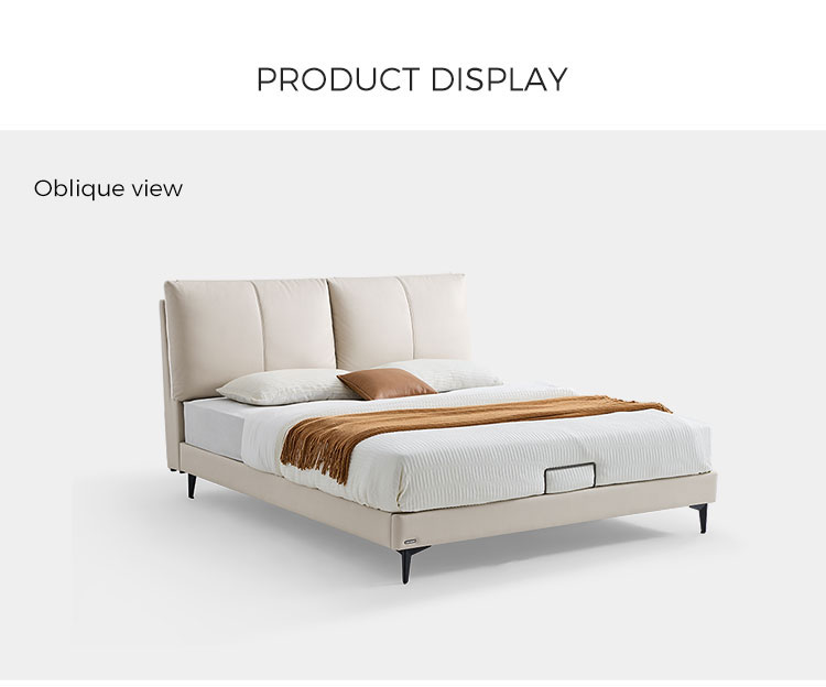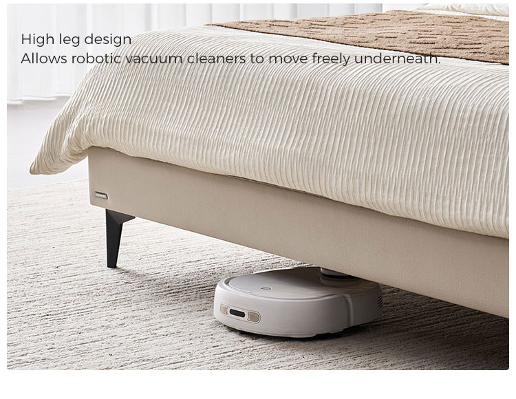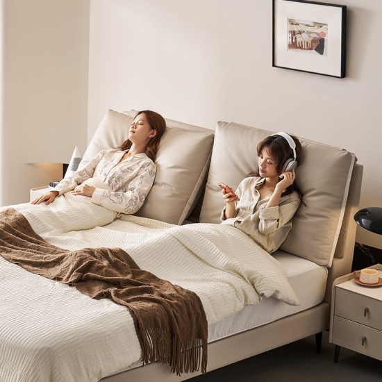 7Cama de madeira e couro na cor bege, estilo moderno, PC589-A