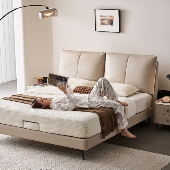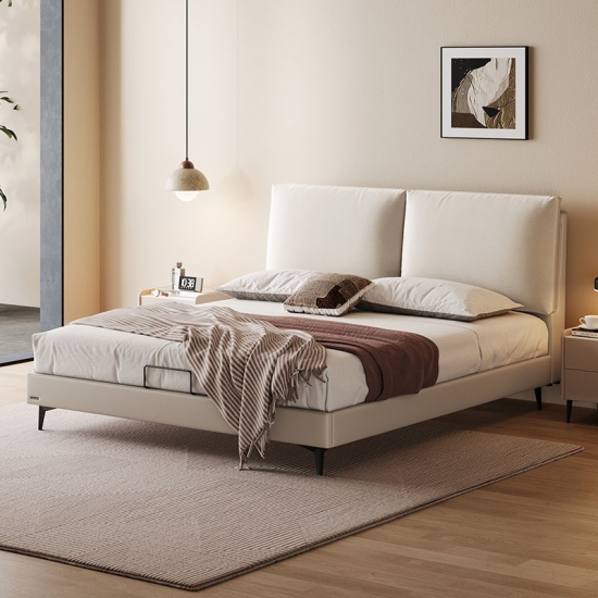 Cama de madeira e couro na cor bege, estilo moderno, PC589-A |