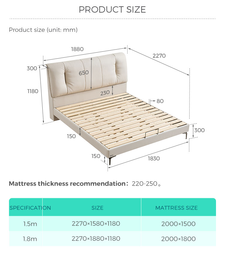 Equipada com um sistema de ripas robusto, projetado para oferecer suporte ideal ao seu colchão, promovendo o alinhamento correto da coluna e conforto duradouro. A marcenaria precisa na estrutura de madeira garante rigidez e elimina ruídos. O estofamento exibe costuras meticulosas e integração perfeita dos materiais.