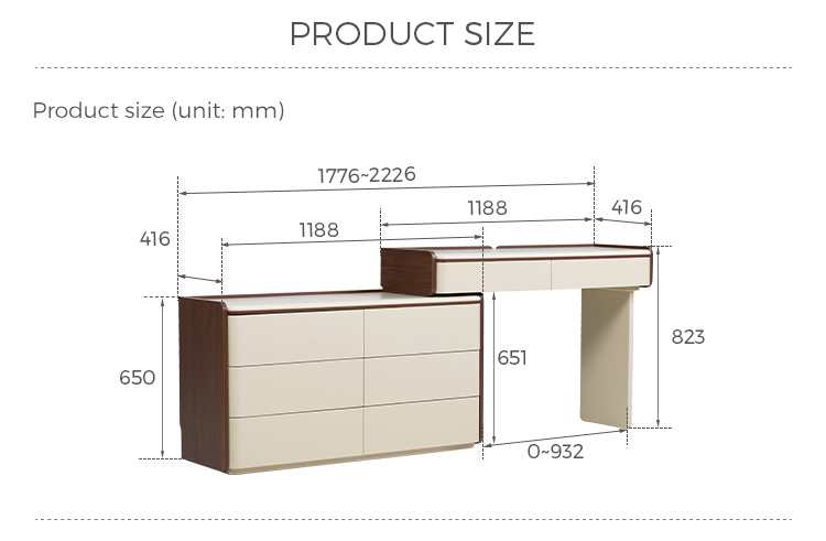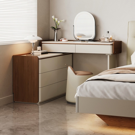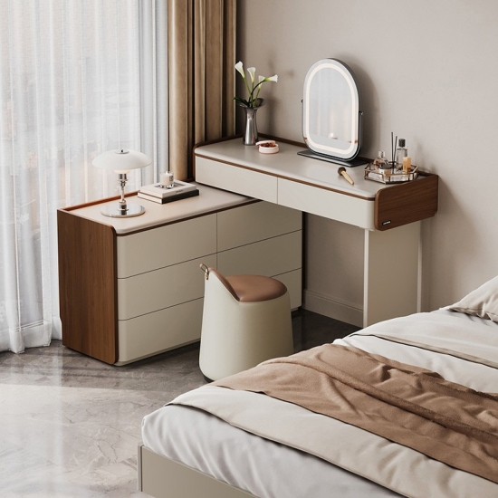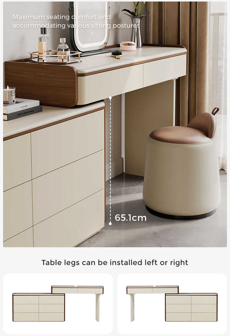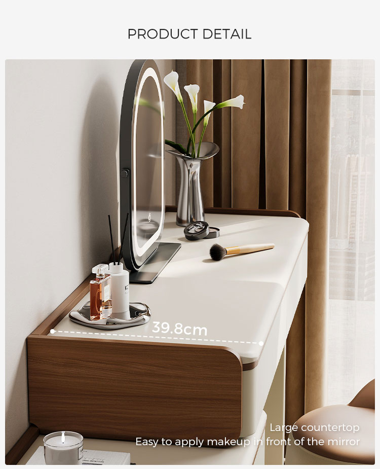 Design harmonioso: Produzida com linhas retas e acabamentos de qualidade, esta penteadeira exala elegância atemporal. O design coeso garante que o espelho, as gavetas e a estrutura trabalhem juntos para criar um ponto focal de luxo refinado.