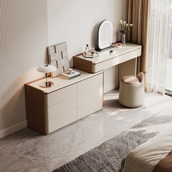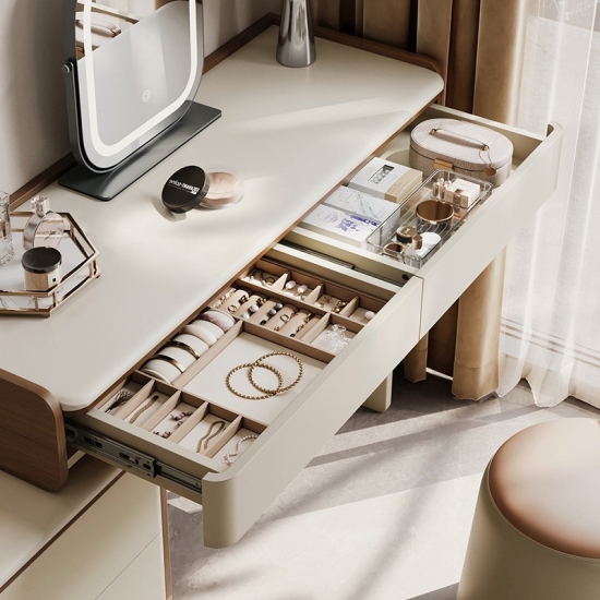 Superfície dedicada para penteadeira: o tampo espaçoso oferece a plataforma perfeita para o seu ritual de beleza. Exiba perfumes, produtos para a pele ou caixas de joias com elegância.