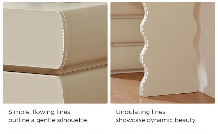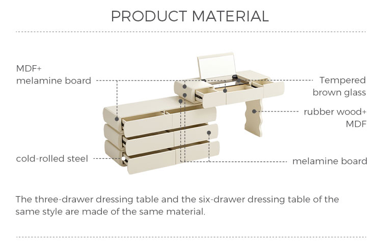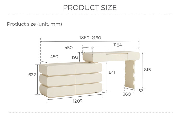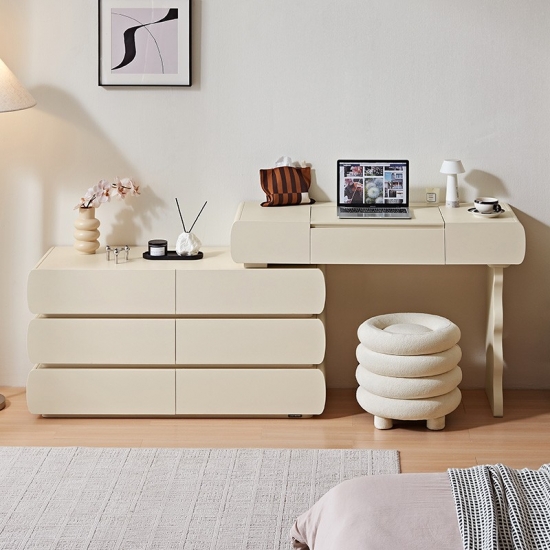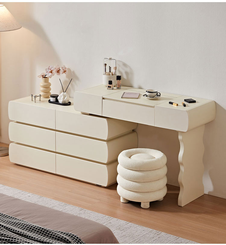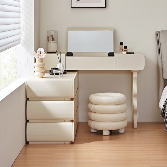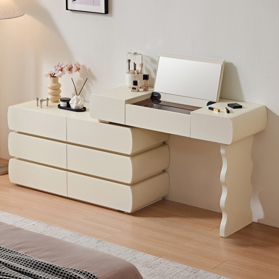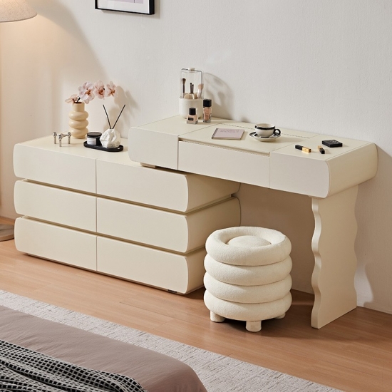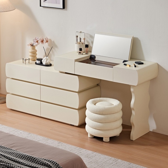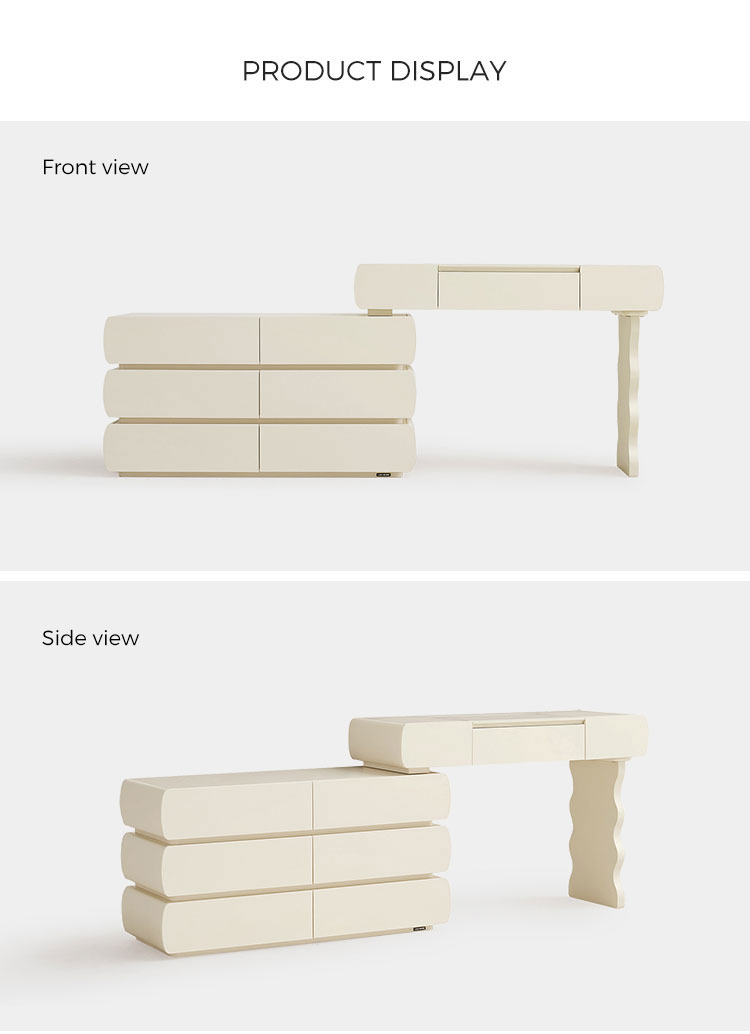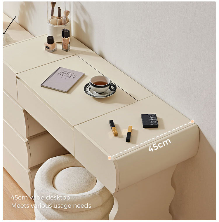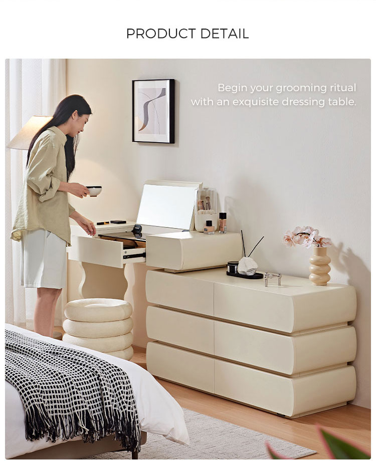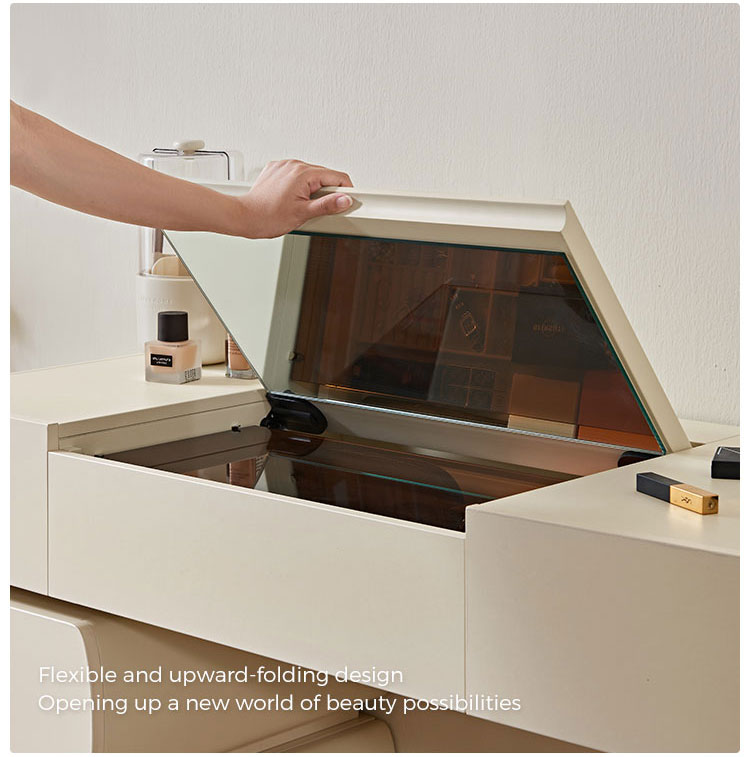 Design harmonioso: Com linhas simples e acabamentos de alta qualidade, esta penteadeira exala elegância atemporal. O design coeso garante que o espelho, as gavetas e a estrutura funcionem em conjunto para criar um ponto focal de luxo refinado.