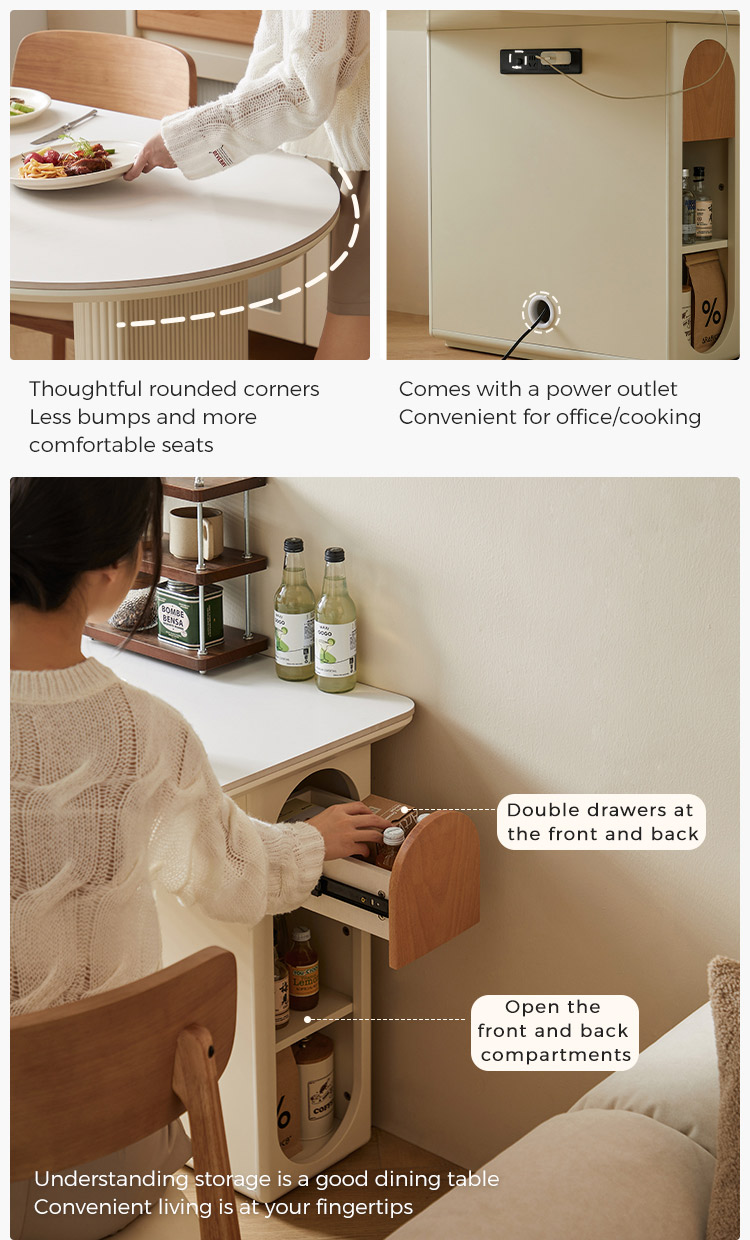 Amplo armazenamento – Compartimentos ocultos para talheres, toalhas de mesa ou decoração.